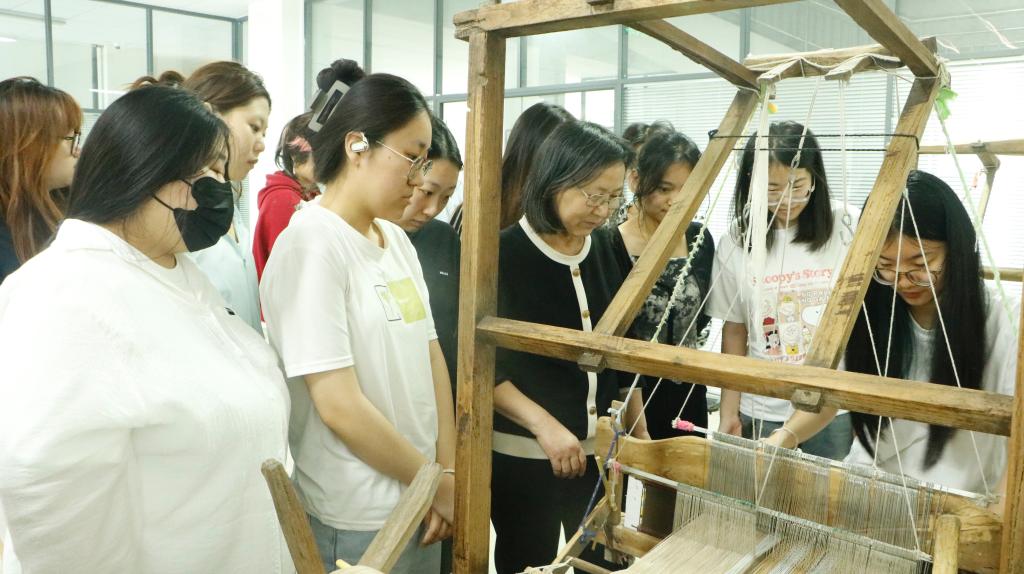 在实训教室内,鲁锦技艺传承人亲自上阵,现场演示鲁锦核心技艺,手把手指导学生操作传统木质织机。从经纬交织的精妙技巧,到“七十二道工序”的工艺精髓,师生们沉浸式体验千年技艺的匠心传承。学生团队在传承人的悉心指导下,对“万字纹”“合斗纹”等鲁锦经典图案进行创新解构,并发挥专业特长,将鲁锦元素巧妙融入服饰、文创等现代设计中,让古老的非遗技艺焕发出新的生机与活力。