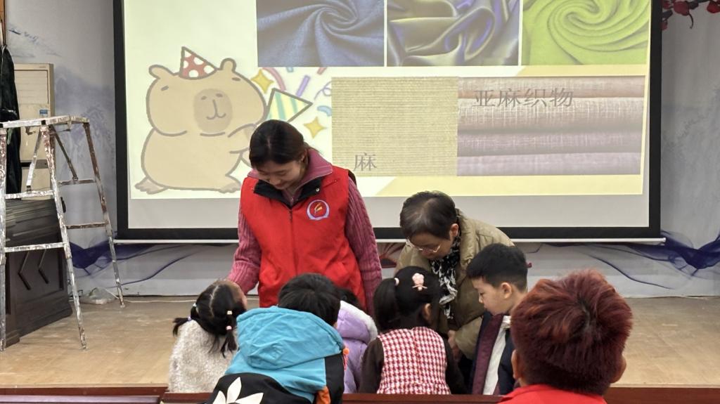 活动中,学院志愿者精心布置活动场地,准备教学物料,并组织小朋友们开展传统“投壶”互动游戏,迅速拉近彼此距离。在知识讲解环节,志愿者借助生动形象的PPT课件,围绕面料的组成类别、功能特性及其应用场景进行系统介绍,以通俗语言阐释“面料超能力”背后的科学原理。其间穿插脑筋急转弯等趣味互动,引导小朋友们举手回答问题,在轻松氛围中加深他们对面料知识的理解。同时,在手工制作环节,志愿者开展一对一指导,协助小朋友们动手完成个性化面料手工作品。现场气氛热烈而欢快,小朋友们在游戏中不仅巩固了新学的面料知识,也感受到了动手实践的乐趣。