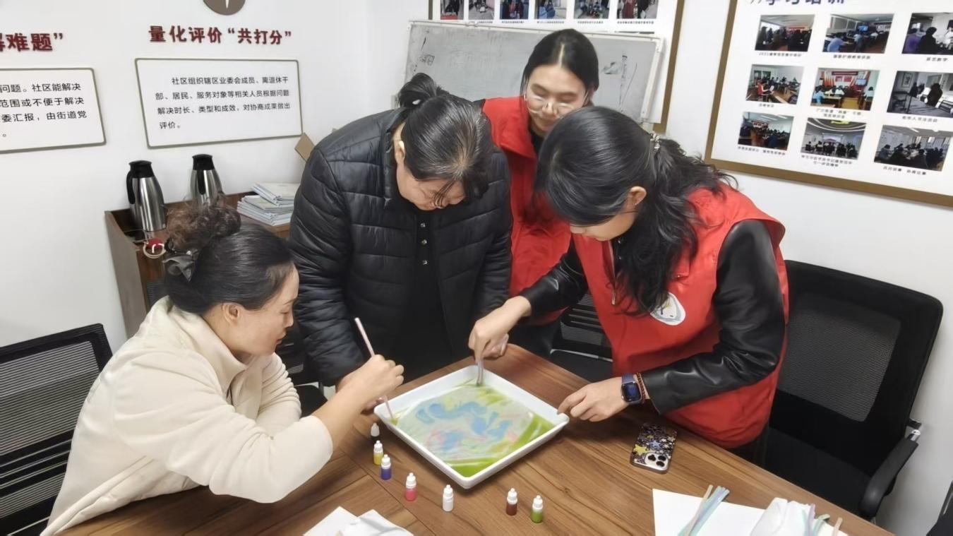 水拓丝巾绘诗意:流动色彩绽放非遗之美。活动开始,志愿者结合专业知识,向居民系统讲解水拓技艺的历史渊源、颜料调配比例及水面张力等要点,演示画针引导颜料流动的基础技法,帮助居民快速掌握操作要领。随后,居民有序参与实践,通过调整划针力度与方向,使水面颜料形成独特花纹,再将丝巾平稳铺于水面完成色彩吸附,一幅幅兼具创意与美感的个性化丝巾作品顺利完成。